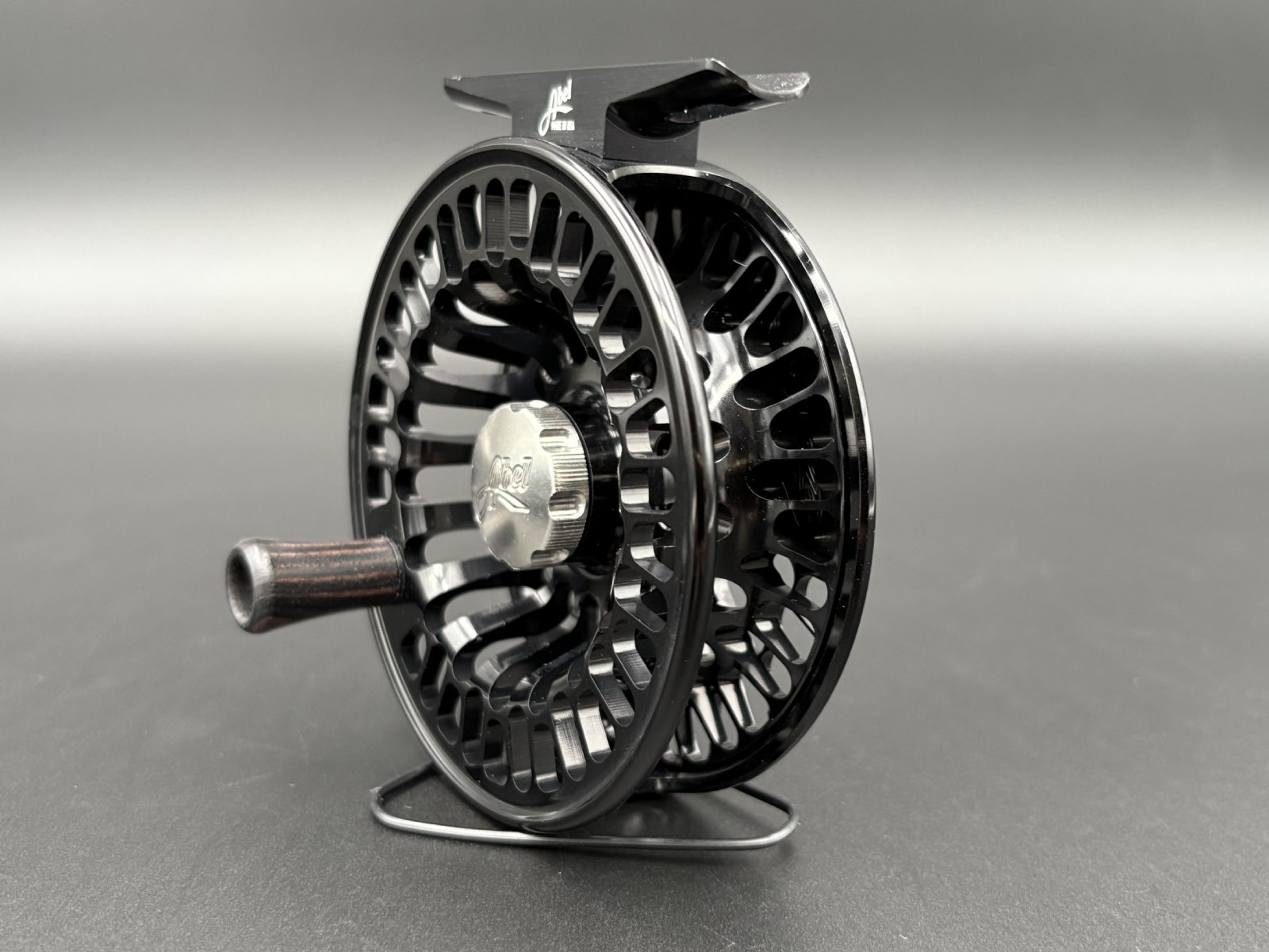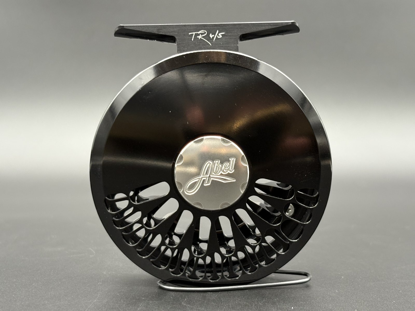 Abel TR fly reel in Black finish with ported spool and palming rim